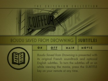 ON THE DVDs (2005): As expected the Criterion appears sharper than the Optimum, has superior contrast, better subtitles and better extras. It does however still show the same damage marks as the Optimum but they mostly less visible. The Criterion also has some minor cropping on the top and occasionally the right edge. The Criterion has some amazing archival extras with stuff from Rohmer et all. We encourage you to buy the Criterion to view Renoir's masterful film. |