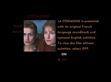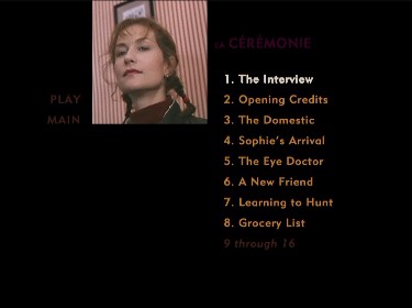 The 2023 Criterion Blu-ray of Chabrol's La Ceremonie is reviewed/compared HERE NOTE: The below Blu-ray captures were taken directly from the Blu-ray disc. ADDITION: Artificial Eye - Region 'B' - Blu-ray - July 12': 8-years on since the Home Vision release and the new 1080P transfer shows significant upgrade - notably via information in the 1.66:1 frame that shows the US DVD to be cropped on all 4 sides and possibly vertically stretched. Colors tighten on the Blu-ray while contrast and detail rise. The SD looks video-like beside the hi-def which, while less-flat, doesn't showcase a lot of depth. The Artificial Eye edition offers lossless 2.0 channel sound, optional subtitles but only a trailer as an extra. This remains a very strong film - with an unpleasantness in the story that makes it unforgettable.***