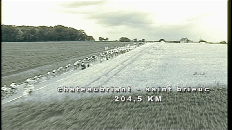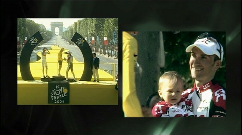 Armstrong, split screen to Riis in the car, voice over of commentator