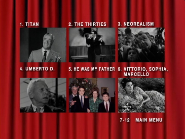 NOTE: The below Blu-ray captures were taken directly from the Blu-ray disc. ADDITION: Lorber - Region 'A' - Blu-ray - May 11': the reasonableness of the 1080P upgrade is exemplified by the interlaced transfer of the DVD. This wouldn't be as impressive to those with higher, more modern film, expectations but as far as being the best home theater representation the Blu-ray is easily the #1 available at present. The hi-def caps are somewhat soft and grainy with noise prevalent on the single-layered rendering. Colors are bright(er), for the most part, and the image quality is consistent with negligible damage. Even with the modest bitrate it certainly provides a far better presentation than the SD NoShame disc.Audio - while lossless (TrueHD) - is original mono with no robust qualities at all (379 kbps). Although it lacks in depth and range it supports the film's dialogue well enough for an enjoyable spin. There are alternate English subtitles on the region 'A'-locked Blu-ray disc. Extras on the Blu-ray are slim with three trailers and Stills gallery but Lorber have thoughtfully provided a second disc DVD with the documentary 'Vittorio D." described as "Seventy years after his first film (Red Roses, 1939) and 35 after his death, Vittorio De Sica remains a celebrated, forgotten and perhaps unknown giant of Italian cinema. His irrepressible humanity, versatility as an actor and intransigence as a filmmaker remain in the shadows. This original and different portrait is created through stories from De Sica’s children – Emy, Christian and Manuel – alongside artists such as Woody Allen, Clint Eastwood, John Landis, Ken Loach and Mario Monicelli." This is an excellent addition to the package and pushes the Blu-ray for solid consideration. We, indeed, recommend. *** ON THE NO SHAME DVD: This anamorphic image is tight to the frame edges but is once again not progressive. It is advertised as "Remastered in high definition from the restored original 2P negative" and looks very strong aside from the 'trailing effect' in many horizontal pans. Colors are excellent and I see no evidence of manipulation. I would say that this DVD looks superior to NoShame's Boccaccio 70' release and like that issue the included liner notes booklet (in this case 30 pages) is quite extensive.