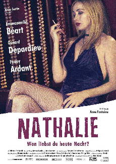 | Nathalie (Emmanuelle Béart) is the name a Parisian prostitute assumes for a special mission or "private investigation." She is engaged for this unusual, and secretive task by a professional, upper middle class wife (Fanny Ardant) who fears her husband (Gérard Depardieu) is unfaithful to her. Nathalie has to seduce the clueless husband and regularly report all details of her relationship with him, including his most intimate sexual preferences in bed. Nathalie is stunning, charming and cunning. Can Nathalie and her reports to the mistrustful wife be trusted? Is the middle aged husband indeed unfaithful? *** Awash in juicy, erotic melodrama but bearing one all-too-obvious plot twist, Anne Fontaine's psychological drama nonetheless provides a glimpse of two generations of French actresses at the top of their game. To think of Nathalie... as 8 Women divided by four would be somewhat misleading: Though it stars two of the duplicitous principals from Francois Ozon's campy 2002 mystery, the tone of this pairing is deathly serious, which makes the script's erotic element all the more believable, but makes its so-what conclusion even more apparent. Writer Philippe Blasband keeps his plot as simple as that of his breakthrough feature, the teasing, enigmatic Une Liason Pornographique, but the questions left unanswered in that film are mostly spelled out here; and although the dynamic between Fanny Ardant and Emmanuelle Béart is never less than fascinating, it does grow repetitive and increasingly less mysterious as Nathalie... progresses. It's rare that a film can generate carnal heat solely through its dialogue, and Ardant and Béart are more than up to the challenge of performing it -- but a breather or two of humor would've gone a long way in making Fontaine's film more believable. |