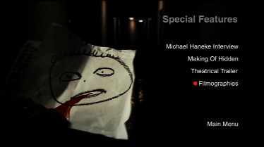 NOTE: The below Blu-ray captures were taken directly from the Blu-ray disc. ADDITION: Artificial Eye - Blu-ray - November 08': A dramatic improvement that I am happy to say resides on a region-FREE Blu-ray disc. The transfer doesn't give away too much of its HDCAM roots - looking a shade glossy at times, but detail has some strikingly detailed moments. The image quality also exhibits some healthy depth. The feature takes up about 20 Gig of space and I see no digital manipulations to enhance the picture. Black levels are piercing and colors (especially skin tones) seem far more true. Audio gets a DTS-HD Master bump and it is apparent in many scenes with both greater range and more subtleties in the mix. Extras are duplicated (see description below of the 2 featurettes) and in the PAL format - meaning they will be inaccessible to most region 'A' player owners. We keep the trailer (it's not in HD - or are any of the extras) but lose the text filmographies. We already endorsed the film and it looks vastly superior with a great new track. Strongly recommended! **** ON THE DVD: For the most part this image looks excellent. It is possible that there is some black boasting, but the 1.78 anamorphic transferred colors and detail are top notch. At times objects in the background can appear out of focus but I can only assume this is how it was shot - I seem to recall a similar technique on Haneke's Code Unknown. Subtitles are well done but a shade high on the screen. Audio is clear and consistent. Extras include an optionally subtitled Haneke interview where he discusses his intent to make the film a 'moral tale' with discussion of the behavioral aspects of his characters. He details certain areas of the film he intentionally left 'open' (without resolve). Also included are a 30 minute "Making of..." featurette that shows cast members discussing the film and deals more with the 'nuts and bolts' of production. A theatrical trailer and some text screen bios are included. Overall this is an exceptional DVD, which we will compare to the Region 1 edition as soon as we can. I don't know if there is such a thing as a typical Haneke feature but his signature style and mise en scène seem imbedded in Cachè. Certainly previous themes of communication breakdown and its social relevance are evident. Another thought provoking piece of modern cinema from Haneke. |