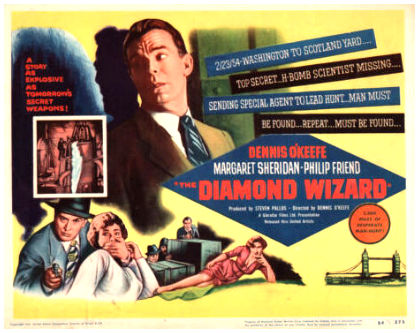 The only Golden Age 3-D feature photographed in Great Britain, The Diamond Wizard (also known as The Diamond) packs suspense and surprise into a supremely exciting film noir thriller. While in London trying to nab the crooks who stole a million dollars from a U.S. Treasury vault, American federal agent Joe Dennison (Dennis O’Keefe, Raw Deal, T-Men) joins Scotland Yard Inspector McClaren (Philip Friend, Buccaneer’s Girl, Spy Hunt) in his search for a missing atomic scientist. They discover that the key to solving both cases may rest with the scientist’s daughter (Margaret Sheridan, The Thing from Another World, I, the Jury) and her fascinating diamond. Co-Directed by star Dennis O’Keefe (Angela) and Montgomery Tully (The Terrornauts). *** While in London trying to nab several fugitives who stole a million dollars from a U.S. Treasury vault, American federal agent Dennison (Dennis O'Keefe) assists Scotland Yard Insp. McClaren (Philip Friend) in his search for a missing atomic scientist (Paul Hardtmuth). The detective duo discovers that the key to solving both cases may rest with the scientist's daughter (Margaret Sheridan) and her fascinating diamond. |