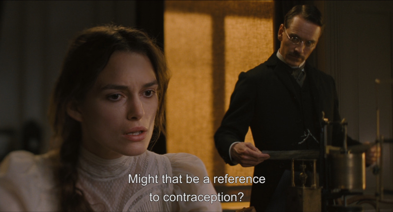 Dangerous Method." Image : NOTE: The below Blu-ray captures were taken directly from the Blu-ray disc. Not a soaring bitrate on Sony's dual-layered Blu-ray transfer - but the 1080P image looks quite strong. Sharpness and contrast are excellent. Visually this is consistent and a pristinely clean representation of the theatrical. There's some depth and the infrequent close-ups impress with strong detail. I don't see evidence of digital tinkering and the accurate 1.85:1 aspect ratio supports a fine, unencumbered, presentation. There isn't anything to overly extol - this just looks very authentic to me - and that should always be the prime goal of the new format transfers.