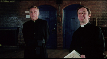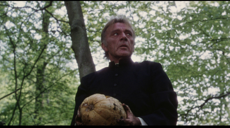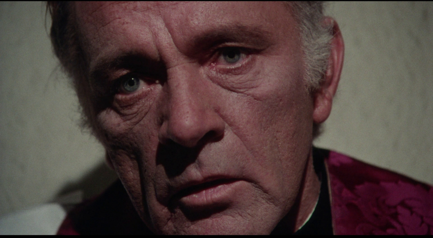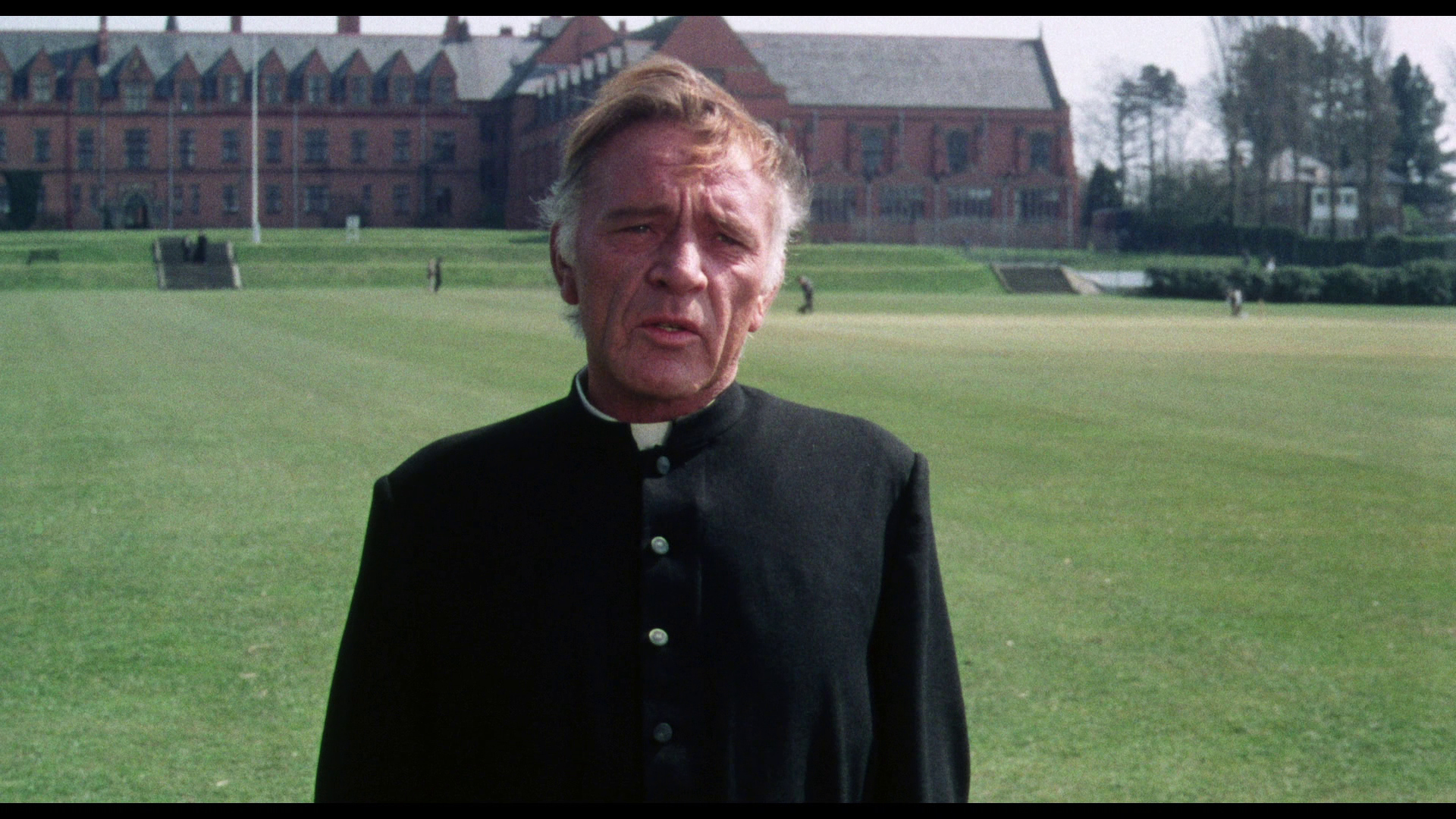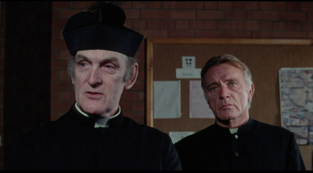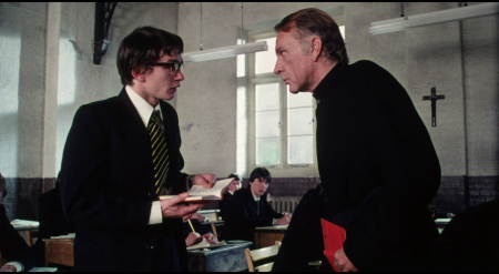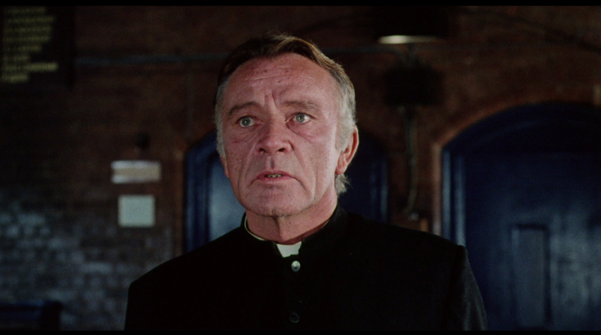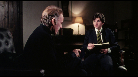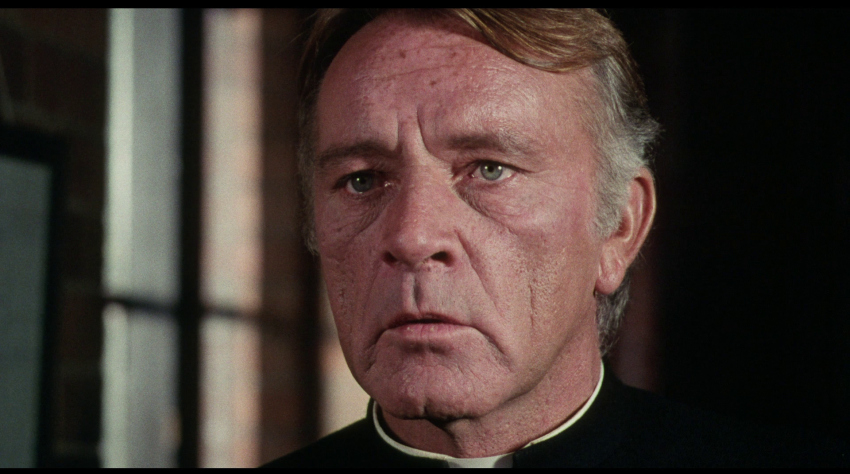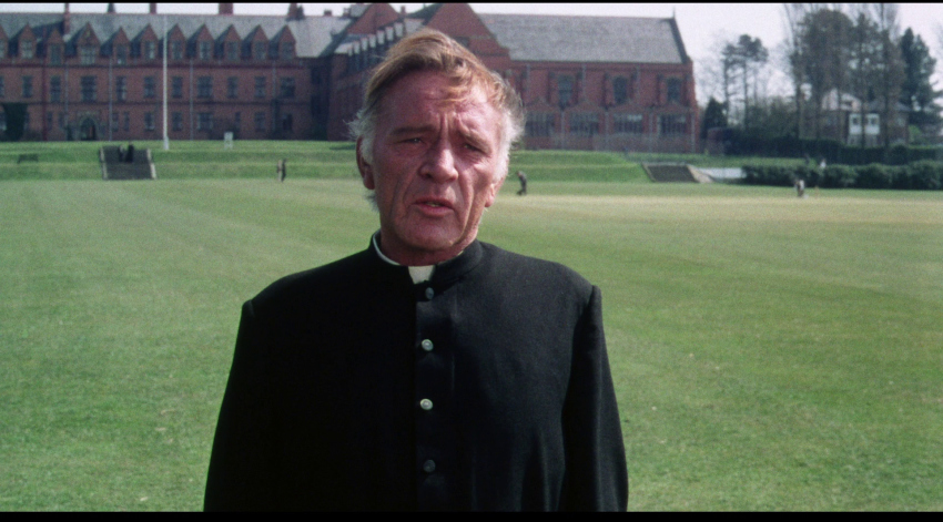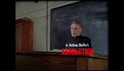 NOTE: The below Blu-ray captures were taken directly from the Blu-ray disc.ADDITION: (November 2025) 88 Films - Region 'B' - Blu-ray: 88 Films have also transferred "Absolution" to Blu-ray. It also presents both the theatrical cut (95:30) and the 2018 director's cut (85:35) in a high-definition 1080P in the original 1.85:1 aspect ratio, sourced from the same 2K restoration used by Indicator and Kino Lorber, delivering a solid upgrade over prior soft and faded VHS/DVD releases with enhanced textures in faces, hair, vestments, and school interiors like stone, woodwork, and stucco walls, though bright exteriors under opening titles appear somewhat soft. There is occasional depth. Colors are natural with agreeable skin tones and greenery in outdoor scenes, grain is fine and filmic, contrast is wide with good delineation in darker sequences, and issues are minimal with rare flare and damage confined to end credits. The visual style of Absolution (1978), lensed by cinematographer John Coquillon (1978's The Thirty-Nine Steps, The Changeling, Straw Dogs, Cross of Iron, The Wilby Conspiracy) emphasizes a deceptive realism that aligns with the era's British cinema, employing muted, autumnal tones to depict England as a colorless, depressive landscape far removed from the vibrant psychedelia of the 1960s. Coquillon's approach creates environments that feel inwardly constricted, heightening the psychological tension as characters navigate shadowy interiors and dimly lit corridors that evoke repression and moral decay. The overall look is elegantly shot, often described as one of the best-crafted films of the 1970s, with a deliberate, slow-building rhythm that mirrors the characters' internal unraveling, transitioning from an initial black comedy vibe - marked by impish expressions and playful misdirection - to a darker, more ominous thriller atmosphere. The cinematography's effectiveness lies in its subtlety, using the rural English setting to foster a sense of stagnation and dread, where the vast outdoors ironically intensifies the characters' entrapment. NOTE: We have added 48 more large resolution Blu-ray captures (in lossless PNG format) for DVDBeaver Patrons HERE. 88 Films provides a linear PCM 2.0 dual-mono track(24-bit) for the theatrical cut, offering depth in elements like banjo strumming and subtle scoring - prolific Stanley Myers (Take a Girl Like You, The Wilby Conspiracy, Eureka, Cimino's The Deer Hunter, Roeg's Insignificance, Harold Becker's The Boost, Pete Walker House of Mortal Sin and Frightmare, etc.) - with clear dialogue and optional English subtitles though the director's cut downgrades to lossy Dolby without subtitles, marking a step back from Indicator's lossless DTS-HD Master for both versions with SDH support, where dialogue is crystal clear, hiss/pops are minimal, and the creepy score sounds strong even in mono. Myers, renowned for works like "Cavatina" from The Deer Hunter, crafts a main theme infused with Irish/Scottish banjo twiddling that playfully references the on-screen music performed by Billy Connolly's drifter character Blakey, whose nimble banjo plucking introduces a bohemian, rebellious contrast to the school's rigid silence. Sound design complements this by emphasizing ambient isolation - rustling woods, echoing confessions, and the stark quiet of the chapel - creating a haunting, foreboding atmosphere that aligns with the visual claustrophobia. There are optional English subtitles on the theatrical cut and the Blu-ray is Region 'B'-locked. The 88 Films disc includes both film versions, a new audio commentary by film historians Kim Newman (The Definitive Guide to Horror Movies) and Sean Hogan (England's Screaming) discussing screenplay origins, Shaffer's works, and thematic parallels like the lack of likable characters, a ported commentary found on the Indicator (as all the rest of the supplements) by Kevin Lyons (The Encyclopedia of Fantastic Film and Television) covering production history, casting, and storytelling devices, interviews "The Devil to Pay" - a dozen minutes - with director Anthony Page on script rewrites and working with Burton, "Them and Us" with actor Dominic Guard on his experiences and co-stars, an image gallery, and the original trailer, but omits Indicator's additional costume designer Anne Gainsford 9 minute interview and 40-page booklet. Absolution stars Richard Burton (The Taming of the Shrew, Raid on Rommel, Bluebeard, The Spy Who Came in from the Cold, Anne of the Thousand Days, Equus, The Medusa Touch, Where Eagles Dare, The Night of the Iguana, Who's Afraid of Virginia Woolf, The Wild Geese, My Cousin Rachel, The Robe, Boom) in a commanding lead role as Father Goddard, a devout Catholic priest at an all-boys boarding school, alongside young actors Dominic Guard (Gandhi, The Watcher in the Woods, Picnic at Hanging Rock, The Go-Between) as the manipulative student Benjamin "Benjie" Stanfield, Dai Bradley (billed as David Bradley - Zulu Dawn, Kes) as the awkward Arthur Dyson, and Billy Connolly (The Boondock Saints, Columbo: The Return, X-Files I Want to Believe) in his screen debut as the free-spirited drifter Blakey. Set against the backdrop of a repressive religious institution, the narrative unfolds as a slow-burning exploration of deception, faith, and moral unraveling, blending elements of mystery, horror, and dark comedy. Produced by Elliott Kastner (North Sea Hijack, Saturn 3, 1978's The Big Sleep, 1975's Farewell, My Lovely, 11 Harrowhouse, The Long Goodbye, Fear Is the Key, X, Y & Zee) and Danny O'Donovan under Bulldog Productions, with cinematography by John Coquillon and a tense score by Stanley Myers, the film was shot on location at Ellesmere College in Shropshire and at Pinewood Studios. Though it premiered in the UK in 1978, legal issues delayed its U.S. release until 1988, four years after Burton's death, contributing to its status as an underseen gem of 1970s cinema. At its core, Absolution interrogates the sanctity
