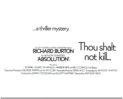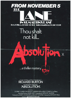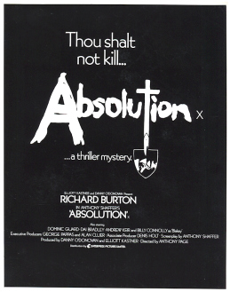 challenged and his life spiralling dangerously out of control. *** Two Catholic boarding school students (Dominic Guard and Dai Bradley) embark upon a carefully calculated campaign to drive their hated headmaster (Richard Burton) insane. The boys launch their scheme by cooking up the most bizarre and depraved of imaginary sins, then recite these infractions in the Confessional. This sadistic little game gets wildly out of hand, resulting in murder. It's a toss-up as to who is the most repulsive character; the headmaster or his two charges. One of a long line of 1970s stinkers barely redeemed by the presence of Richard Burton, Absolution was not released until 1988, long after Burton's death.… |