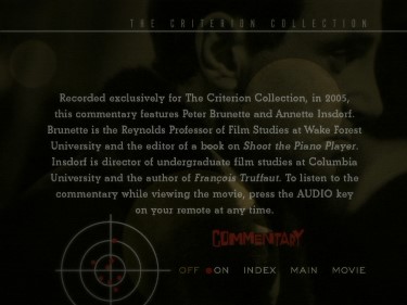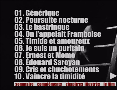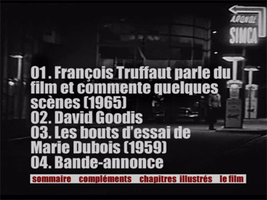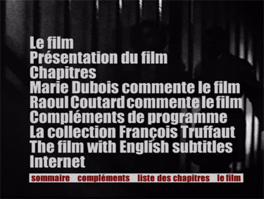 NOTE: The below Blu-ray captures were obtained directly from the Blu-ray disc. ADDITION: Artificial Eye - Region 'B' Blu-ray - July 2014: Yes, quite nice. The screen captures indicate the advancement in the visuals via Artificial Eye's 1080P transfer. Superior contrast, frequent depth , deeper black levels and notably sharper - still maintaining textures and there is no digital manipulation. No noise. I think it looks quite strong - better than I was anticipating.Audio comes via a linear PCM 2.0 channel stereo track at 1536 kbps in the original French. It is predictably flat but has some tightness not present on the SDs. Georges Delerue (Jules et Jim, The Woman Next Door, The Last Metro, Day For Night) did the score and it also benefits from the uncompressed rendering. There are optional English subtitles (they are optional!) on the Region 'B'-locked Blu-ray disc. Supplements replicate some of what was on the mk2 DVD with the commentary track by Raoul Coutard - with English subtitles (see sample), a brief introduction by Serge Toubiana, 3-minutes of screen tests of Marie Dubois and a trailer. I had not seen this in almost a decade. I loved it - the improved a/v bolstered my appreciation. I can't wait to see more upcoming Truffaut on Blu-ray. This absolutely gets our endorsement! ***