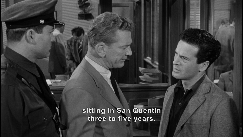 NOTE: The below Blu-ray captures were taken directly from the Blu-ray disc. ADDITION: Classicflix Region 'A' - Blu-ray - April 2018: Th is is another vintage crime-thriller from ClassicFlix - on Blu-ray - like their The Killer is Loose, Crime of Passion, Another Man's Poison, You Only Live Once, T-Men... 'Dark Cinema' fans are very pleased despite this not reaching the lofty Noir branding!ClassicFlix transfer has a high bitrate and this 1080P transfer is in the 1.75:1 aspect ratio - removing the superfluous headspace if the 1.33:1 DVD and adding more information on the side edges. It is far brighter than the SD transfer and has fewer marks, far more detail and superior contrast . It's quite s step up although retaining the heaviness and film-like look of film. I was pleasantly surprised with the HD presentation.A DTS-HD Master (24-bit) audio 2.0 channel mono is utilized. There are minor effects but w e get a compelling score by Paul Sawtell (S.O.S. Tidal Wave, Another Man's Poison, Silver City, The Fly, Denver and Rio Grande) that supports the film well in the lossless. There are optional English subtitles (see sample below) on the region 'A' Blu-ray disc.No extras at all - a true bare-bones disc but the price reflects that. This is another appealing ClassicFlix Blu-ray. Down Three Dark Streets is a well-above average crime-thriller with excellent performances from Broderick Crawford, always sexy Ruth Roman, Kenneth Tobey, Claude Akins and many will recognize a young William Schallert... I thoroughly enjoyed my superior viewing on ClassicFlix Blu-ray - love the cover - absolutely recommended! *** ON THE DVD: Down Three Dark Streets is an unusual crime drama with three different investigations intertwined to find a cop killer. MGM released the film as part of their now defunct Limited Edition Collection of made-on-demand discs. The progressive transfer is open-matte and per usual for MGM black-and-white films in this collection, there is a greenish hue on some monitors. The mono soundtrack is decent, but there are no extras provided on the disc. |