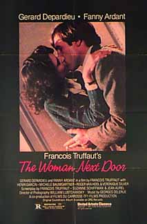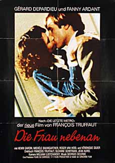 Bernard Coudray has a beautiful family and is happy with his life. That is untill Phillipe and Mathilde Bauchard move in to the house next door. Bernard and Mathilde know each other, they were once passionately in love but went their separate ways. Once reunited, the pair start a fervent but turbulant affair. Torn between their unyielding lust for each other and the comfort and stability that is their marriages, this really is a case of can't live with and can't live without. The ghost of a tempestuous affair is reawakened when the two lovers, estranged for 10 years and now both newly married, coincidentally move next door to each other. François Truffaut wrote the leading roles especially for his two stars, Gerard Depardieu and Fanny Ardant. *** Although an air of artificiality in it, I really enjoyed this 2nd last film by master Truffaut. An exploration of the disastrous effects of uncontrollable desire and passion which actually sprung from Truffaut's obsession to work with actress Fanny Ardent (with whom he had a child). Depardieu and Ardant, are both married, yet decide to rekindle their past affair, with devastating consequences. The late climax of the film is very reminiscent of Chabrol with its unlikely and heavy-handed finale. But then again sometimes life is very much like that. This is a very memorable, if uncomfortable, film. |