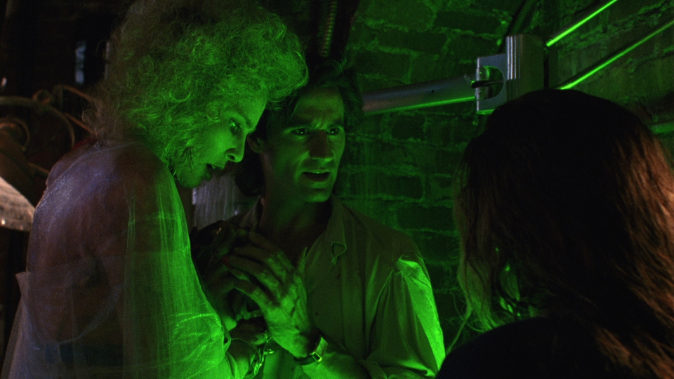 NOTE: The below Blu-ray captures were taken directly from the Blu-ray disc. ADDITION Arrow Blu-ray - April 2016: Perhaps a silly comparison but it does reveal some interesting details. Arrow's 1.78:1 aspect ratio shows more on the sides than Pioneer Open Matte 1.33:1 but less on the top and bottom. These are 2K restorations of both the Un-Rated and R-rated versions on separate Blu-rays. The Un-Rated is on a dual-layered disc with a max'ed out bitrate and looks pretty crisp with some depth and tightness. The R-Rated is only on a single-layered disc and is slightly inferior but obviously a huge leap over the SD transfer.Both version have linear PCM 2.0 channel at 2304 kbps. The score by Richard Band (The House on Sorority Row, Re-Animator, The Pit and Pendulum, Puppet Master etc.) benefits from the uncompressed and the audio has depth accentuating the mood. The Arrow offers optional English (SDH) subtitles for both versions and it is region FREE. Extras are endless and are described by Arrow