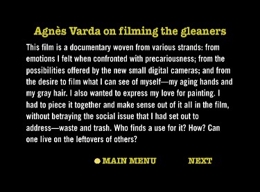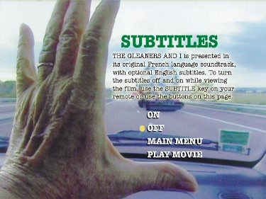 - December 2017: The Zeitgeist DVD was interlaced but the film was shot in 1080i (with the Sony DSR-300) and the new UK Blu-ray is accurately in 1080i (25fps - PAL) but, while the image has a very waxy and video quality - it doesn't have the combing on the SD transfer - which can, actually, look crisper than the Blu-ray. I suspect this is the way it, authentically, looks. In the film Varda talks about her exploration of HD video and the versatility it has, trick shots etc. You can get the Sony DSR-300 for very cheap now (and then!) as the technology has advanced significantly since 2000. I suppose this could have been transferred to 35mm first but the image wouldn't improve in the real sense. With the DV camera used - this is the way The Gleaners and I looked.The audio is in linear PCM (16-bit) in the original French language with no demonstrative effects. Being a documentary there is no dramatic score but music credited to Joanna Bruzdowicz (Kung-Fu Master, Vagabond and The Gleaners & I ) and Isabelle Olivier, plus Apfelsextett composed by Pierre Barbaud. Again, a function of the production limitations. The dialogue and narration is clear and the Region 'B' Blu-ray has burned-in English subtitles (see samples below). There are supplements including the, hour-long, Two Years Later documentary - a kind of extension, wrap-up of the film following a few individuals. Plus there is the 20-minute The Little Museum featurette and a brief Homage to Zgougou the Cat piece. Varda's intentionally amateurish-looking film remains impactful examining France's age-old practice of rescuing edible food - either by the poor or for other, noble or efficient, reasons. The Blu-ray is no prize visually but it has its place in her oeuvre. Not an example to show off your HD system, but still a meaningful documentary and another significant part of The Agnès Varda Collection.*** ON THE DVD: Not a fatally poor image, but a weak one to be sure. Non-progressive (note combing in last large capture) and sometimes appearing a little saturated, the image has some artifacts and appears to have been taken from an analog source. I dislike the yellow subtitles, but applaud the addition of The Gleaners and I: Two Years Later. Good liner notes and a decent package if only the image were improved. Well, we will take what we can get. The film is strongly recommended. |