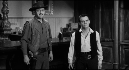 Vampiric gunfighter Drake Robey (Michael Pate, Hondo) goes West and terrorizes a small town. When the fiend sets his fangs on beautiful rancher Dolores (Kathleen Crowley, Target Earth), it’s up to Preacher Dan (Eric Fleming, TV’s Rawhide) to destroy the gun-slinging bloodsucker with a bullet mounted with a cross. The first film to mix cowboys and vampires, Curse of the Undead features striking black-and-white cinematography by Ellis W. Carter (The Incredible Shrinking Man) and co-stars John Hoyt (When Worlds Collide), Bruce Gordon (Tower of London), Edward Binns (12 Angry Men) and Jay Adler (99 River Street). Directed by Edward Dein (Shack Out on 101) and written by Edward and Mildred Dein (Calypso Joe). *** If it weren't for the unambiguous title, I'd be tempted to classify Curse of the Undead as a western, albeit with strong horror elements. Certainly all the classic Western plot elements are there: a dispute over water rights; a beautiful, plucky heroine doing battle with a corrupt land baron; the heroine's hot-headed younger brother who itches to mix it up with the land baron and his hired thugs; the straight-as-an-arrow fiancé who at first urges caution, but in the end must fight for what's right; a well-meaning but ineffectual sheriff trying his best to keep the peace; drunken cowboys drawing on each other in a saloon, and of course the hired gun dressed in black… who just happens to be a vampire. Excerpt from Films From Beyond the Time Barrier (Brian Schuck) located HERE |