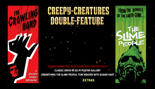 This VCI Blu-ray set punches above its weight in supplementary material. Extras are generous for a double-feature budget release and focused on fan-friendly historical context. The Slime People features a full-length audio commentary by Rob Kelly (artist - Real Retro Cinema Column, reviewer, podcaster, and film buff) on The Crawling Hand, covering everything from a curious Full Metal Jacket music connection to rumors of an international nude scene. A 55-minute audio-only interview “Unearthing The Slime People” pairs Tom Weaver (A Sci-Fi Swarm and Horror Horde; Interviews with 62 Filmmakers by Tom Weaver - 2010-02-25) with actress Susan Hart (accompanied by stills and images), offering candid talk about her early career and the film’s no-budget realities. A short video featurette (“Rubber Monsters, Real Fears: Exploring 1950’s and 60’s Sci-Fi Creature-Features”) provides a quick overview, while a 7-minute classic drive-in sci-fi poster gallery adds fun visuals. The packaging features original cover art by Robert Kelly on one side and retro artwork on the flip, plus a limited-edition slipcase for the first 1,500 units. Are VCI improving?