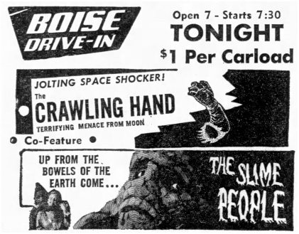 The Crawling Hand (1963): 1:28:06.197 The Slime People (1963): 1:16:59.323 |