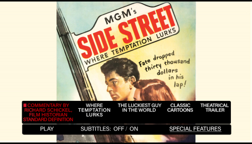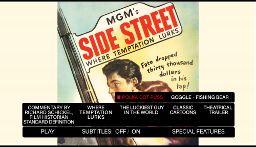 Edition Details: • Commentary by Richard Schickel • Featurette: Side Street: Where Temptation Lurks (5:49) The Luckiest Guy in the World (21:09) Classic Cartoons: • Polka Dot Puss (7:44) • Goggle Fishing Bear (7:21) • Theatrical trailer (2:25)