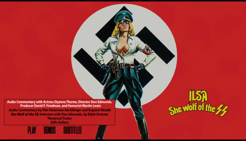 Edition Details: • Audio Commentary by Actress Dyanne Thorne, Director Don Edmonds, and Producer David F. Friedman, Moderated by Humorist Martin Lewis • NEW Audio Commentary by Film Historians Kat Ellinger and Evgueni Mlodik • She Wolf of the SS: Interview With Don Edmonds, by Elijah Drenner (29:27) • Theatrical Trailer (3:59) • Stills Gallery (6:06)
