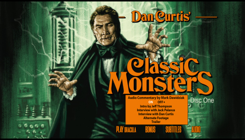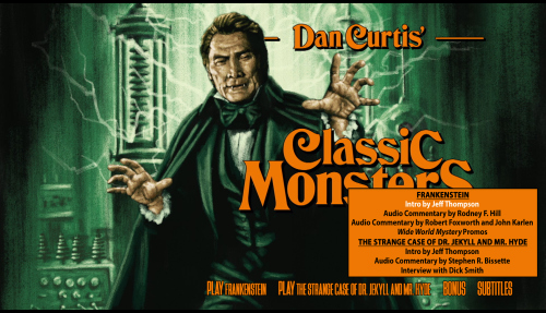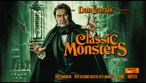 Edition Details: Blu-ray 1 • Introductions to All Films by Jeff Thompson, Author of The Television Horrors of Dan Curtis (Dracula - 7:02, Frankenstein - 4:15, The Strange Case of Dr. Jekyll and Mr. Hyde - 4:33) • Dracula Audio Commentary by Mark Dawidziak • Dracula Interview with Actor Jack Palance (3:54) • Dracula Interview with Producer/Director Dan Curtis (4:20) • Dracula Alternate Footage and Scenes (6:29) • Dracula Trailer (2:52) Blu-ray 2 • Frankenstein Audio Commentary by Film Scholar Rodney F. Hill (Hofstra University) • Frankenstein Audio Commentary with Actors Robert Foxworth (Victor Frankenstein) and John Karlen (Otto Roget) • Frankenstein ABC-TV Wide World Mystery Promos (9:43) • Dr. Jekyll and Mr. Hyde Audio Commentary by Author, Artist and Film Historian Steve Bissette • Dr. Jekyll and Mr. Hyde Interview with Makeup Effects Artist Dick Smither (5:35)