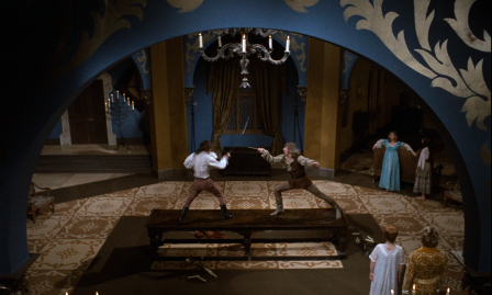 with swords clashing across the room, toads croaking from discrete